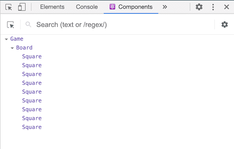Square component sẽ render một <button> và Board sẽ render 9 ô vuông (9 Square component). Game component render một bàn cờ (Board component) với các ô giá trị sẽ được sửa đổi ngay sau đây. Hiện tại bạn chưa thể tương tác với component nào.